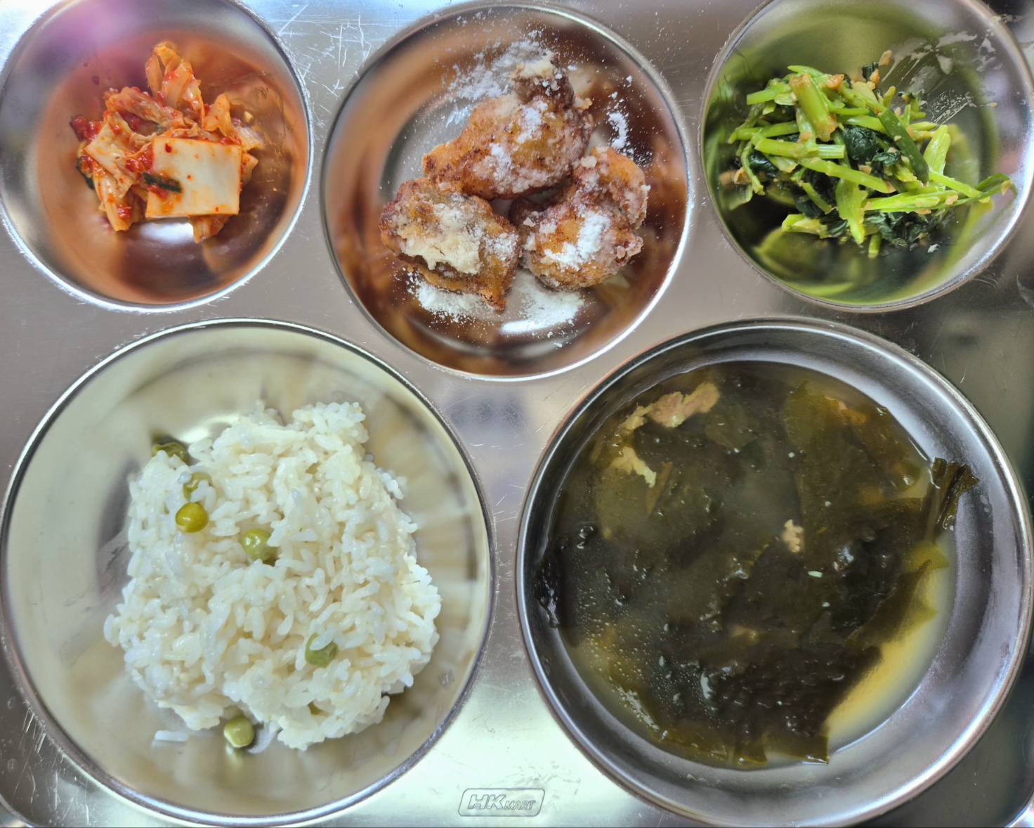 완두콩밥 쇠고기미역국(5.6.16) 시즈닝아귀강정(2.5.6.16.) 참나물쌈장마요무침(1.5.6.) 배추김치(9) * 에너지/단백질/칼슘/철 485.1/27.8/285.5/2.5
