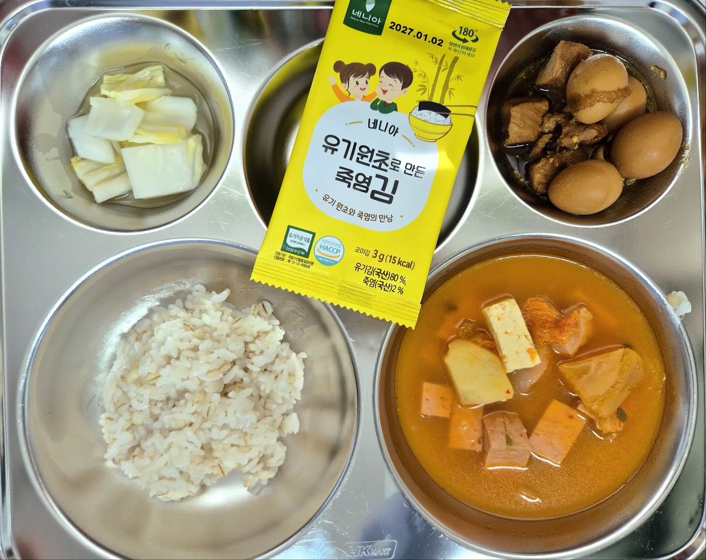 압맥밥 스팸감자짜글이(5.6.9.10) 돈육메알조림(1.5.6.10.18) 백김치(9) 유기농김 * 에너지/단백질/칼슘/철 631.4/30.6/215.8/3.4