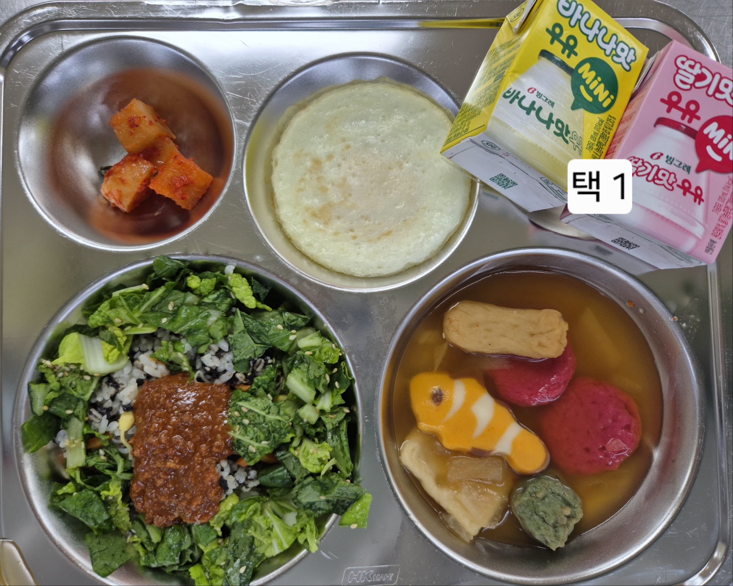 얼갈이비빔밥(5.6) 한우볶은고추장(5.6.16) 니모어묵탕*얼큰(1.5.6) 계란후라이(1.5) 깍두기(9) 우유(2)(바나나/딸기 택1) * 에너지/단백질/칼슘/철 646.8/31.6/414.7/3.7